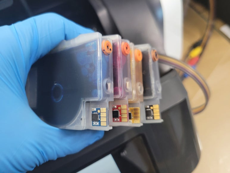 출력불량 및 잉크 카트리지 문제로 빠른 전체 점검 필요 이유 : 1. 호스 내 잉크 경화로 잉크공급 不 2. 카트리지 부싱 및 패킹 노후로 공기유입으로 잉크공급 不 3. 헤드 內 잉크공간 챔버 터짐 (칩판부 슈팅에어라인 비닐탈락, PCB 오염) 4. 스테이션 펌핑모터 불량으로 인한 잉크공급 不