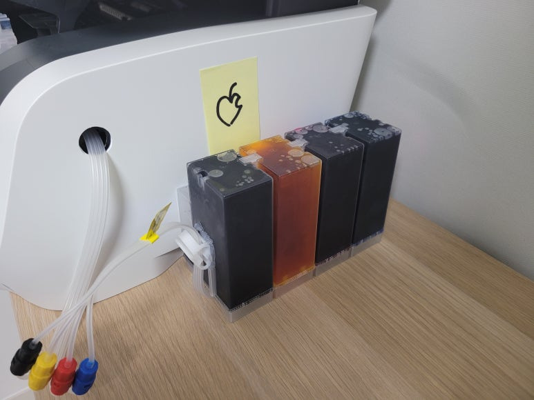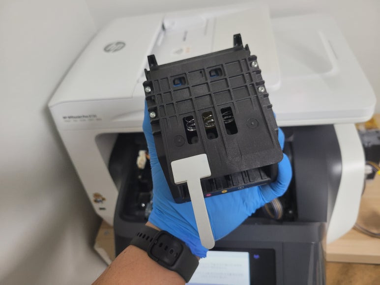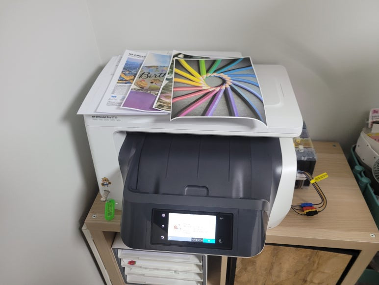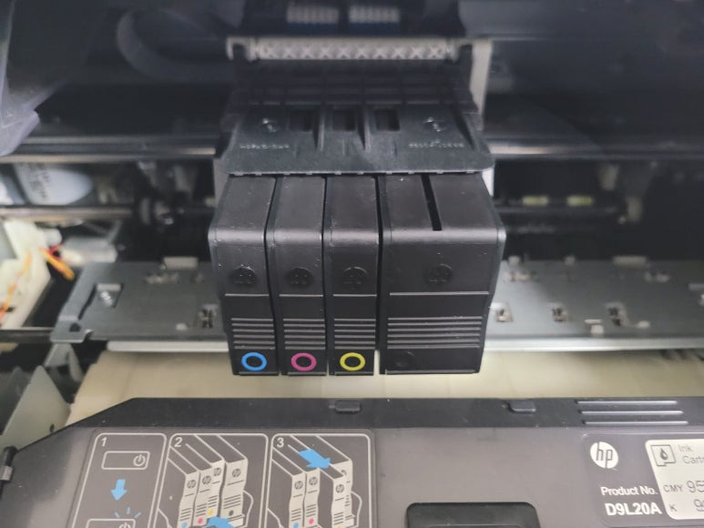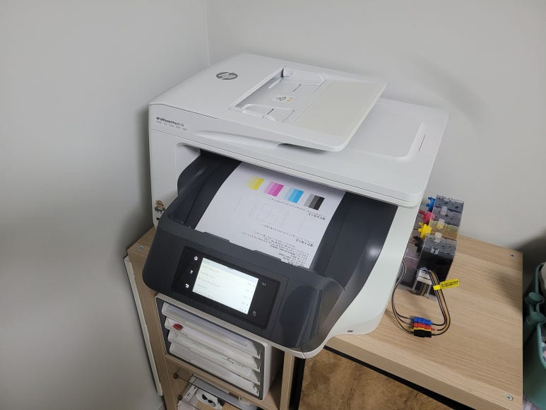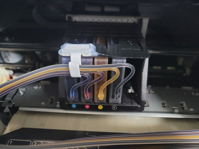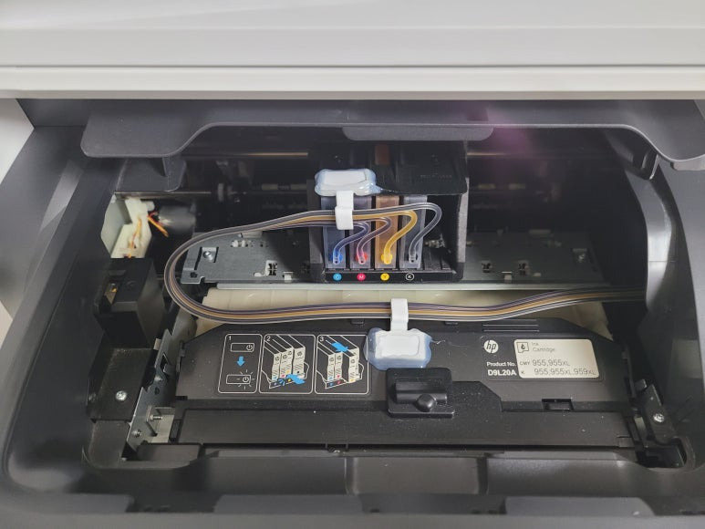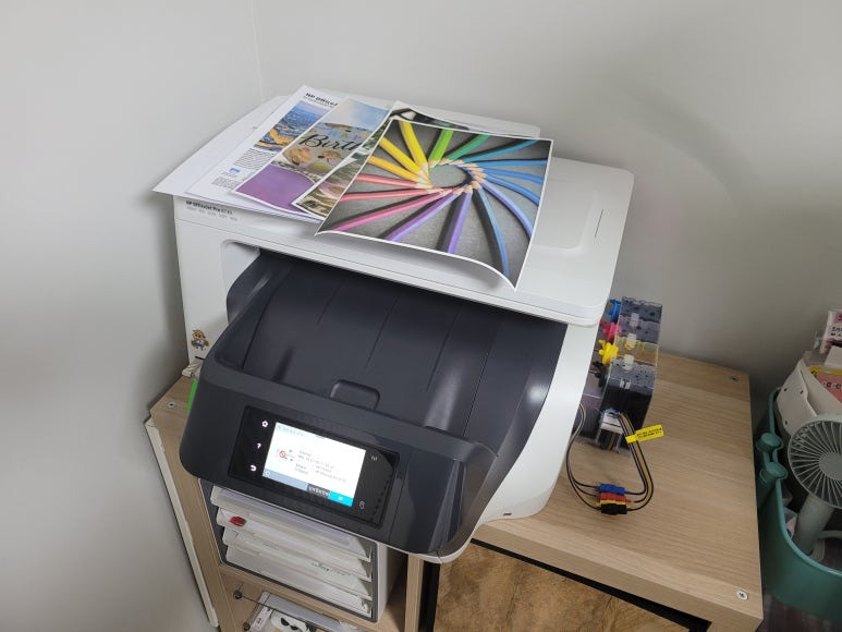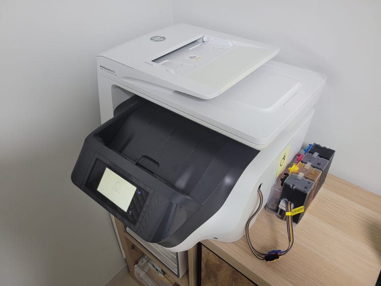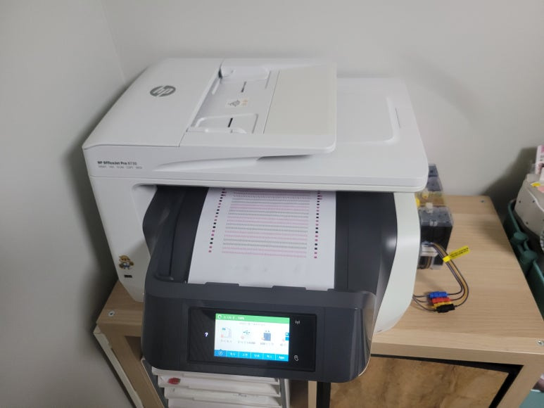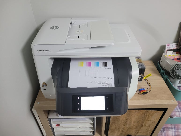 경기도 고양시 덕양구 오금동 소재, 가정에서 재택근무용으로 스캔, 팩스 및 문서 출력용으로 사용하는 HP OfficeJet Pro 8730 팩스복합기 인데 잉크가 고갈된 정품 카트리지를 제거하고 색당 200ml 무한잉크 장치로 장착요청하여 스케줄 잡아 이동, 방문하여 수리 완료 했습니다.