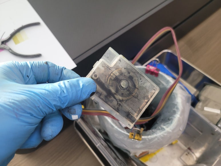 ● 프린터 헤드 클램프 부착 및 핫멜트 보강, 호스 재정리 장착