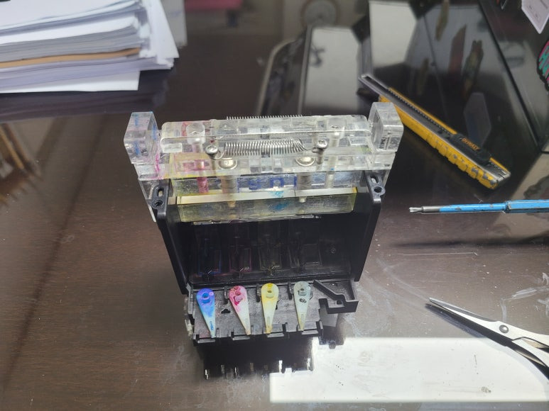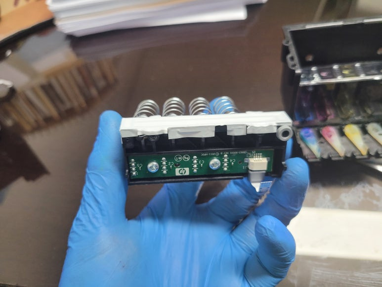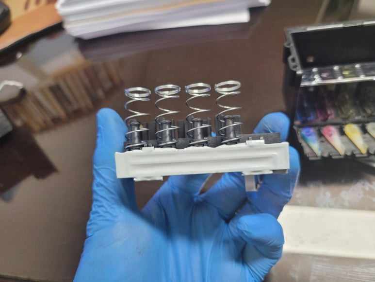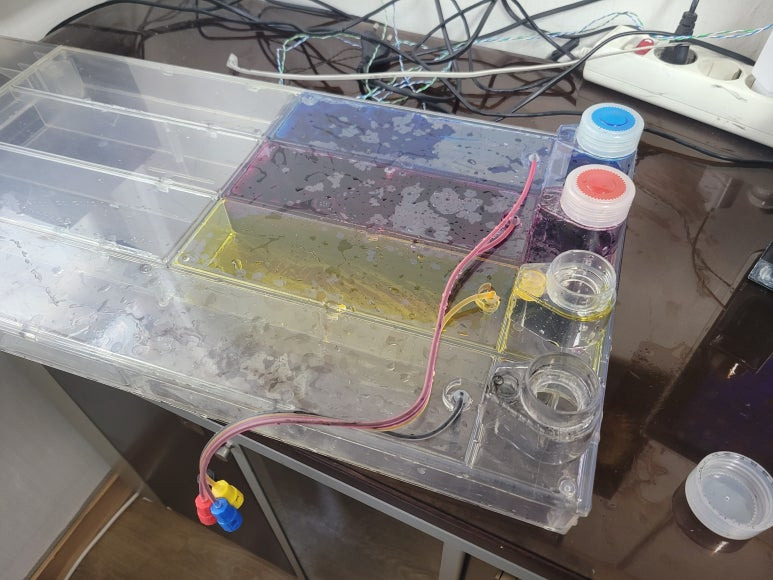 잉크공급기에 있는 잉크를 모두 비워내고, 세정 및 새로운 잉크로 충전. 호스 및 카트리지 또한 세정하고 새로운 잉크로 치환하여 충전하게 됩니다. 잉크트러블 및 노즐막힘 헤드 또한 분해하여 세정액을 주입하여 기존 잉크 세정 및 노즐막힘 처리하는 과정입니다.