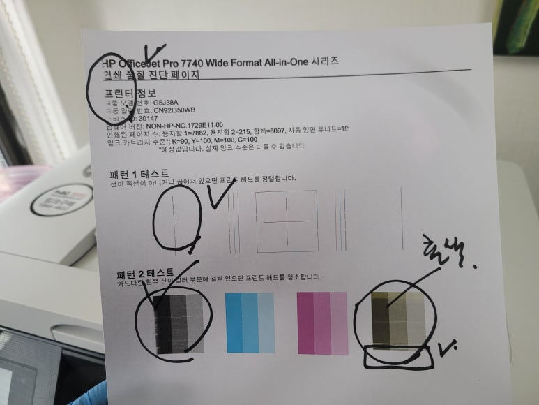 경기 안양시 만안구 위치한 학원에서 사용하는 HP OfficeJet Pro 7740 무한잉크 팩스복합기 출력불량 원인은 BK 블랙(검정) 색상 잉크 트러블 인한 헤드 노즐 막힘으로 출력 불량으로 헤드 분해 세척 수리와 근본적인 원인인 잉크 트러블은 신규 잉크 치환 처리였습니다.