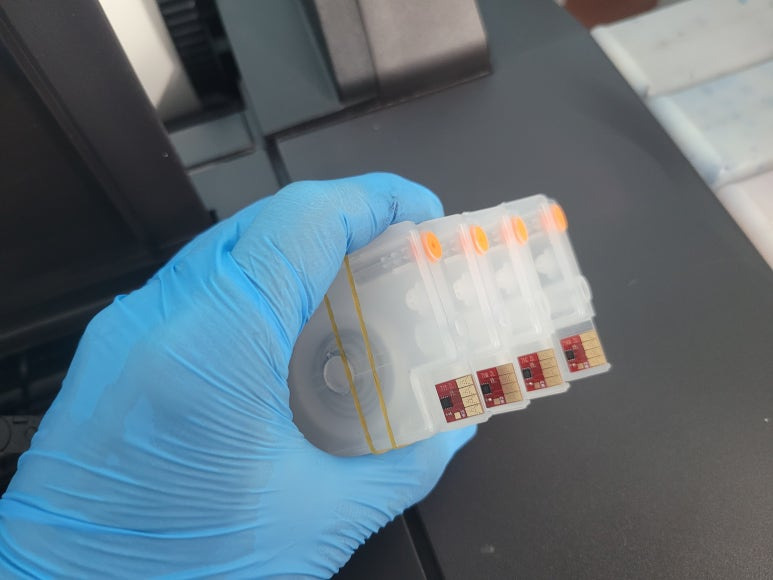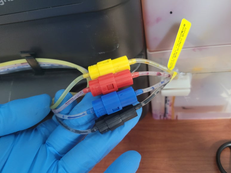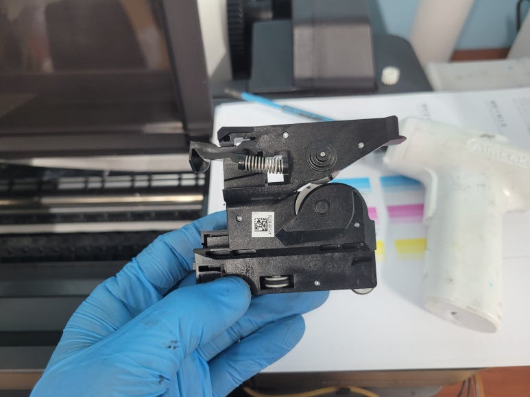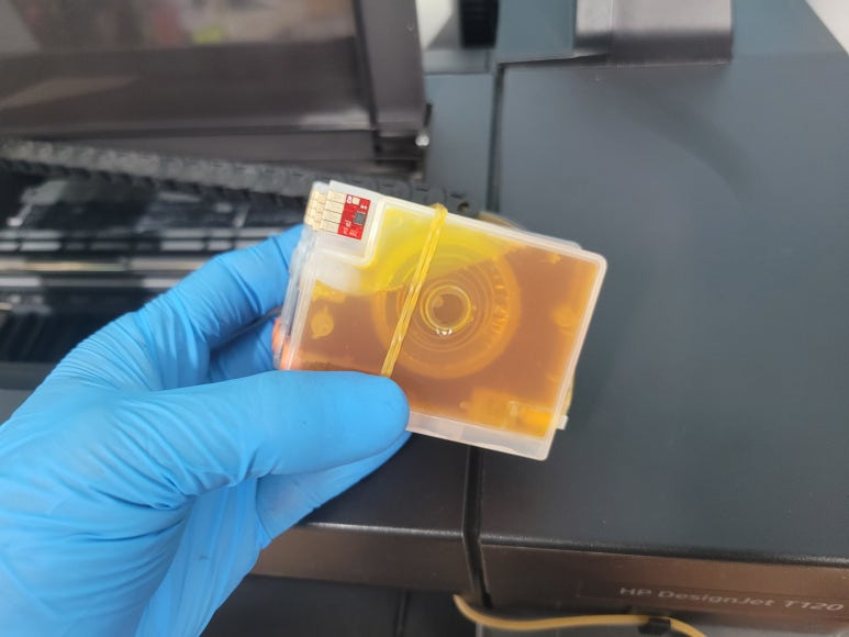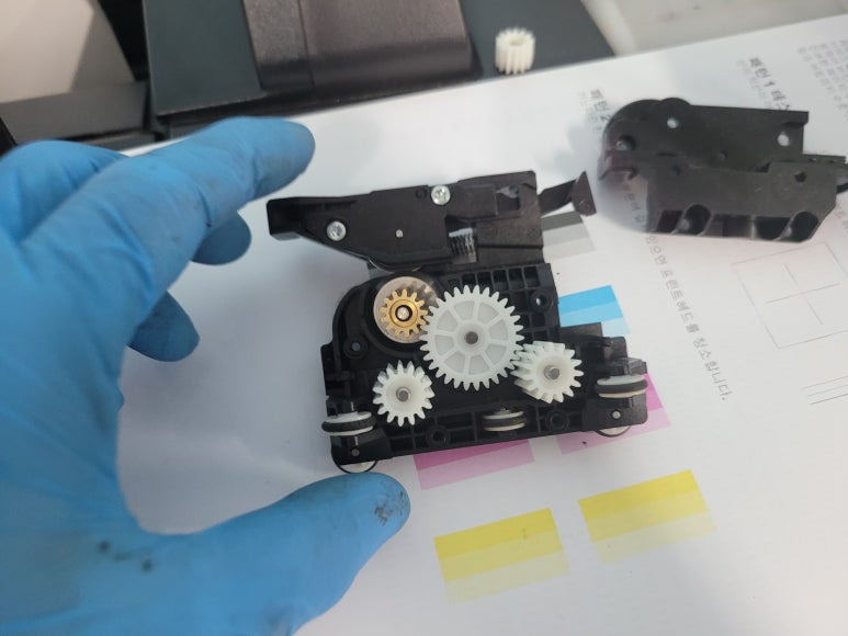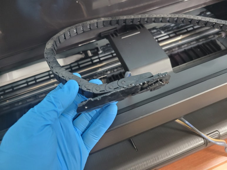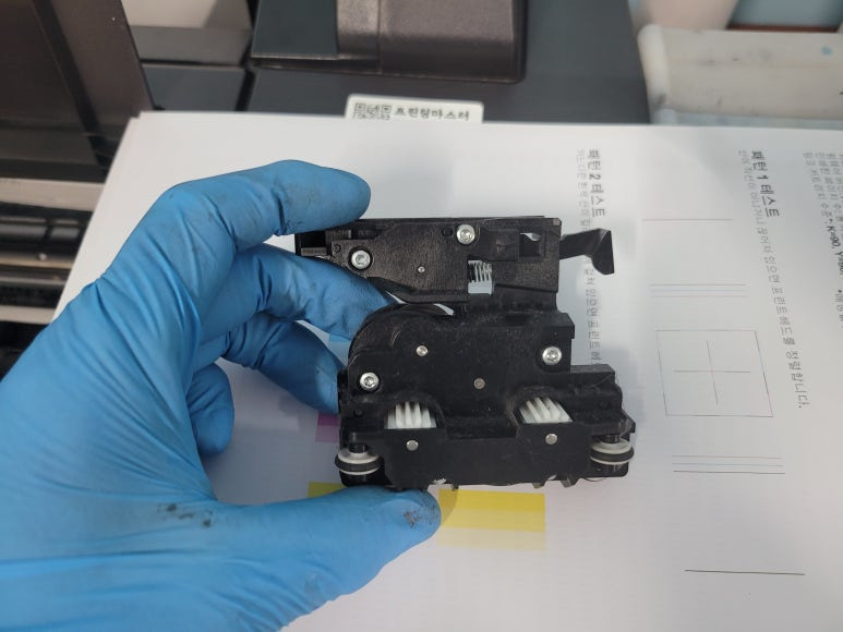출력불량 및 잉크 카트리지 문제로 빠른 전체 점검 필요 이유 : 1. 호스 내 잉크 경화로 잉크공급 不 2. 카트리지 부싱 및 패킹 노후로 공기유입으로 잉크공급 不 3. 헤드 內 잉크공간 챔버 터짐 (칩판부 슈팅에어라인 비닐탈락, PCB 오염) 4. 스테이션 펌핑모터 불량으로 인한 잉크공급 不