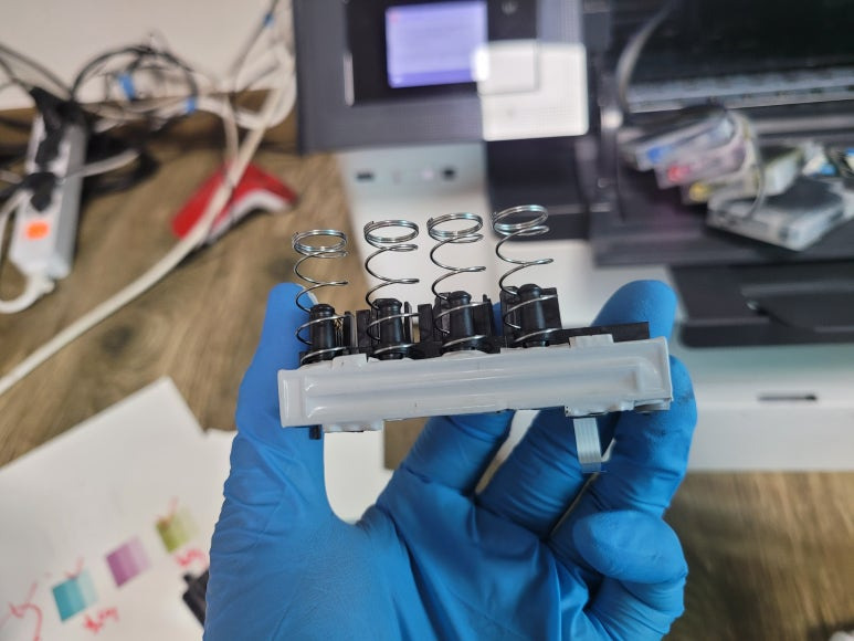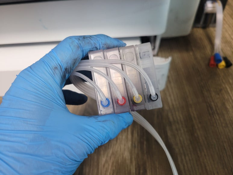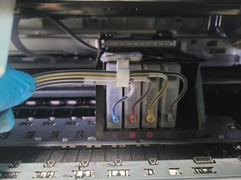 ● 프린터 헤드 클램프 부착 및 핫멜트 보강, 호스 재정리 장착