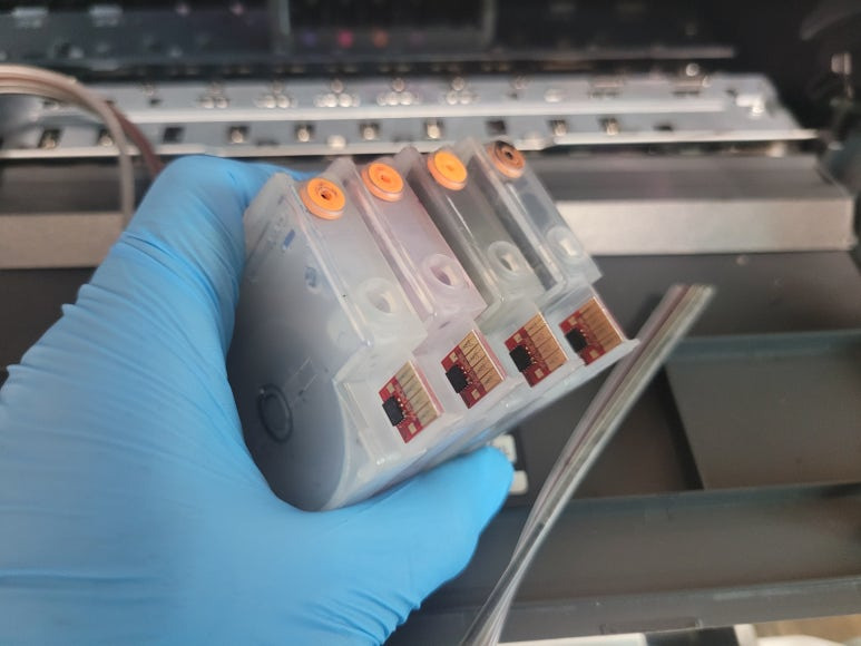 출력불량 및 잉크 카트리지 문제로 빠른 전체 점검 필요 이유 : 1. 호스 내 잉크 경화로 잉크공급 不 2. 카트리지 부싱 및 패킹 노후로 공기유입으로 잉크공급 不 3. 헤드 內 잉크공간 챔버 터짐 (칩판부 슈팅에어라인 비닐탈락, PCB 오염) 4. 스테이션 펌핑모터 불량으로 인한 잉크공급 不