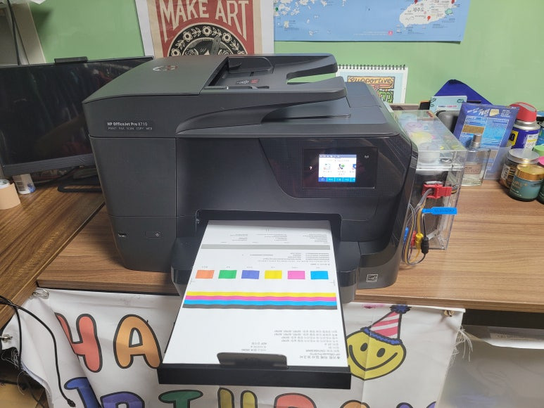 HP OfficeJet Pro 8710 팩스복합기 무한잉크 장치는 소모품 시스템 문제 및 공급 시스템 문제는 전면 커버를 열었다 닫았다 3회 진행하면 카트리지 확인 후 정상 작동됩니다.