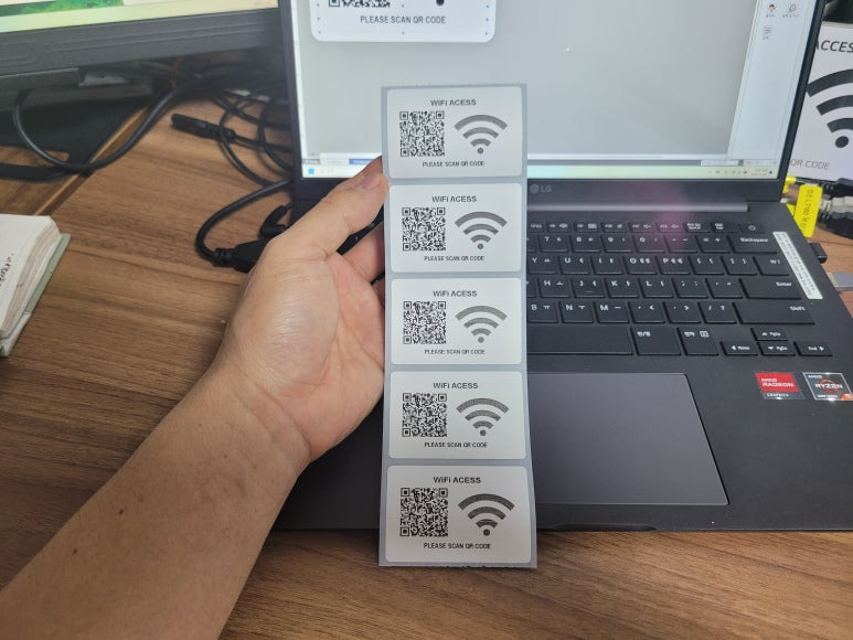 다운로드한 QR코드와 와이파이 픽토그램을 가지고 고속출력 기업용 브라더(brother) TD-4D 라벨 프리터로 60X40mm 방수 라벨지에 올려 출력해봤습니다. 가장 쉽고 빠른 방법입니다. 100~200장이든 정말 빠른 속도로 출력할 수 있으나 라벨지 프로그램에서 직접 제작되너가 제공된 코드와 클립아트가 아닌 이미지를 올리다 보니 선명도는 떨어집니다. qifi.org에서 제공된 QR코드 이미지 축력도 선명하고 스캔 인식도 잘 되는 반면에 모바일에서 제공된 이미지는 출력 후 카메라 스캔 인식되지 않습니다.