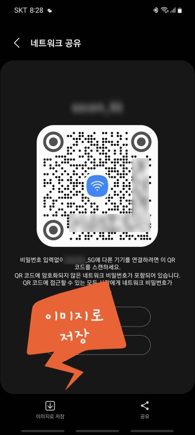 휴대푠의 현재 연결된 Wi-Fi 의 톱니바퀴 모양의 설정을 클릭하면 하단에 QR코드를 이미지 저장할 수 있습니다.