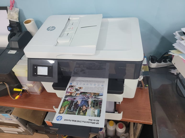 강원도 원주시 호저면 소재 전기 건설 건축관련 사무실에서 A3 도면 출력용 및 팩스 스캔 복사 문서출력용으로 사용하는 HP 오피스젯 프로 7740 무한잉크 팩스복합기인데 그린스크린 12345 오류 발생으로 출장수리 요청, 스케줄 잡아 이동하여 수리 완료했습니다.