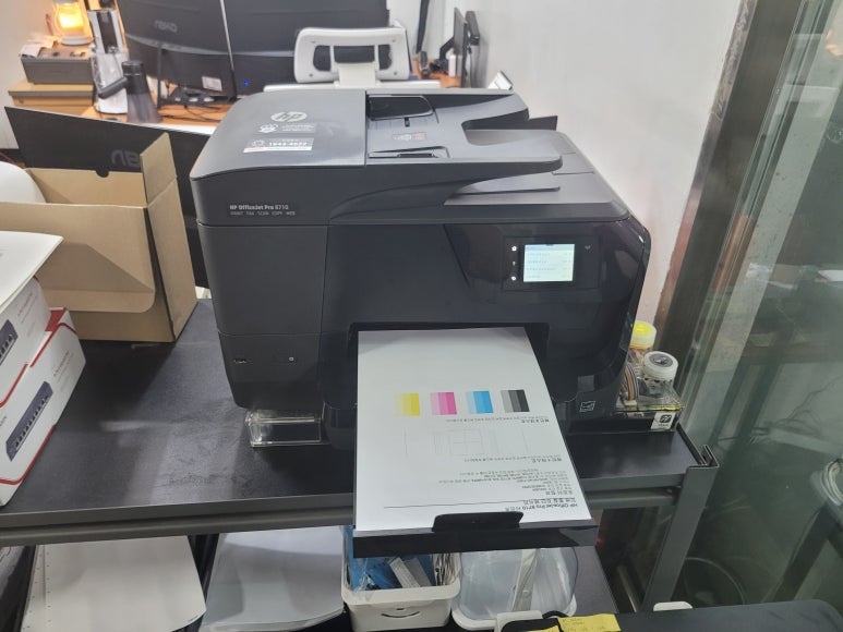 서울시 용산구 컴퓨터 네트워크 관련 유통 및 판매 관련 업체에서 견적서 및 거래명세서 출력 문서 및 팩스,스캔, 복사 출력용으로사용할 HP 8710 팩스복합기 무한잉크 임대 설치 요청으로 1년 약정 자동연장 , 월 무제한 출력기준 월 55,000원, CMS 자동 계좌이체 계약으로 HP 8710 무한잉크, 임대형 및 기업형, B2B용 (보험사, 군부대, 학교, 학원, 부동산, 핸드폰매장, 교육사 등등)으로 사용되는 칩없이 구동하는 기업형 No Chip (Chipless Solution) 무한잉크 팩스복합기 장비를 스케줄 맞춰 출장설치 완료 했습니다.