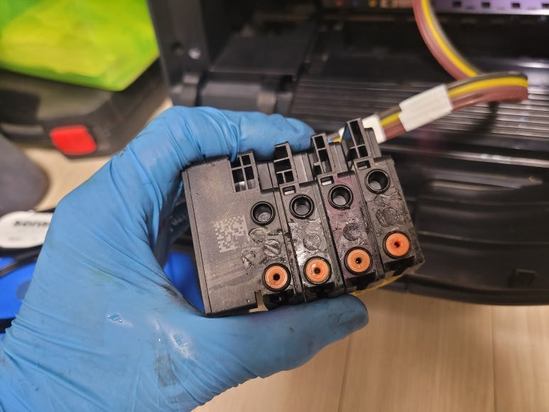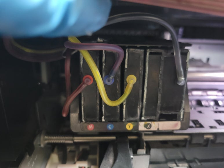 출력불량 및 잉크 카트리지 문제로 빠른 전체 점검 필요 이유 : 1. 호스 내 잉크 경화로 잉크공급 不 2. 카트리지 부싱 및 패킹 노후로 공기유입으로 잉크공급 不 3. 헤드 內 잉크공간 챔버 터짐 (칩판부 슈팅에어라인 비닐탈락, PCB 오염) 4. 스테이션 펌핑모터 불량으로 인한 잉크공급 不