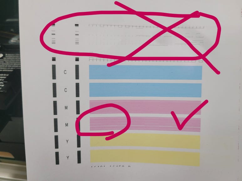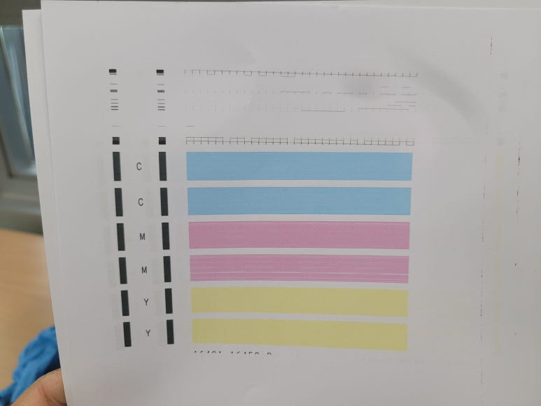 액정에서 ⚙️ 설정➡보고서➡ ⚠인쇄품질보고서/진단페이지 확인