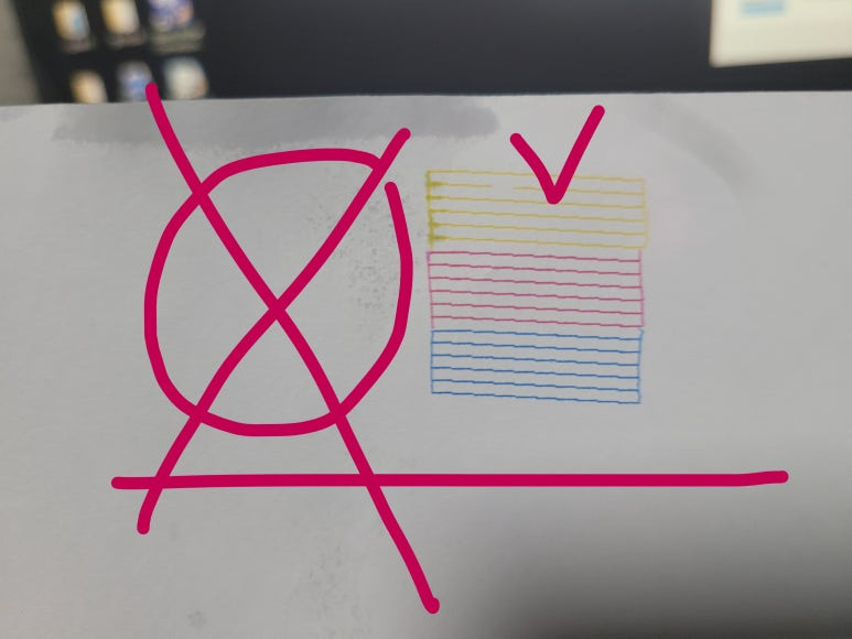 헤드/카트리지 노즐 손상 및 내부 오염 및 패드에 잉크가 차서 흐르고 문제가 발생됩니다.(유지보수탱크/잉크패드 수명 단축/교체, 캐논 5B00 오류) 평소 꾸준한 운동 (4색 칼라 출력) 및 건강검진(노즐 점검)을 생활화 해주세요.