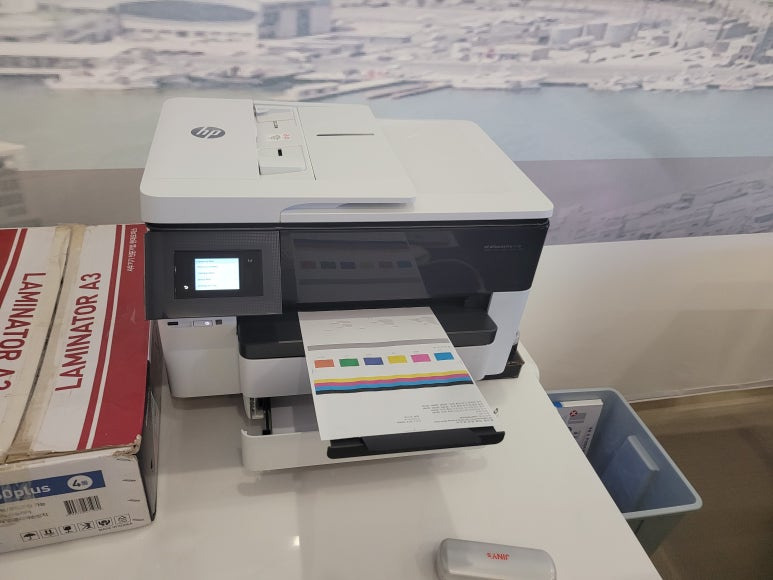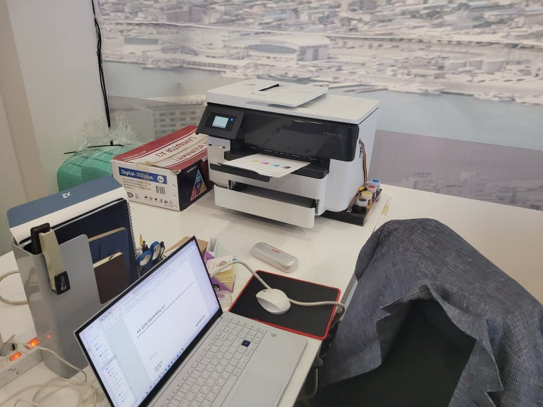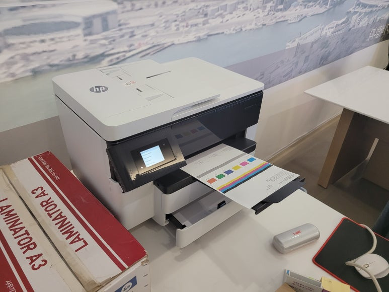 아파트 모델하우스 내 분양사무실에서 각 분양팀에서 홍보물 출력용으로 사용할 HP OfficeJet pro 7740 무한잉크 A4 A3 팩스복합기, 칩없이 구동하는 Chipless solution 임대설치했습니다. 2~3개월 정도 짧은 기간에 사용할 수 있는 단기임대 무제한 출력, CMS 자동계좌이체 계약 설치완료 했습니다.