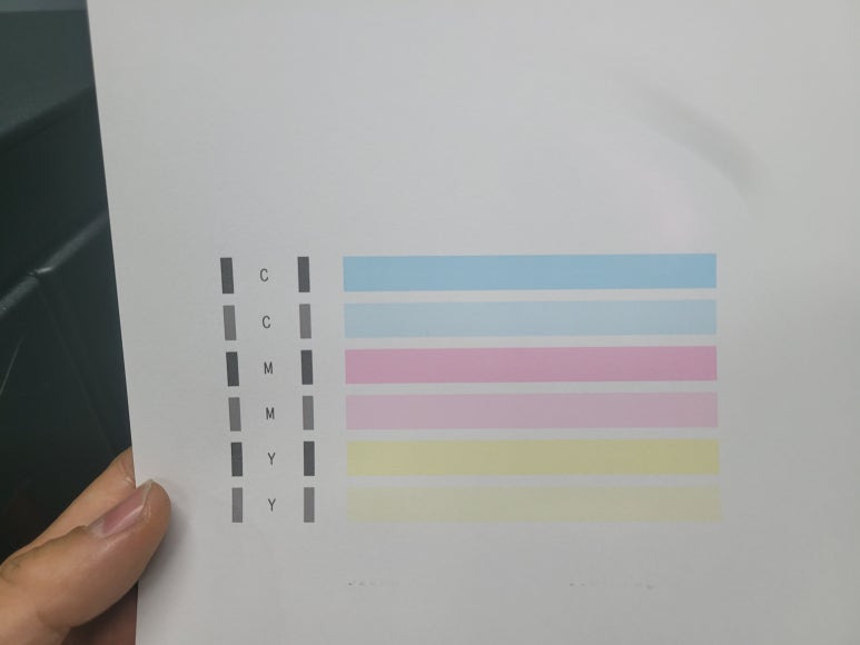 출력불량 시에만, 액정에서 ⚙️ 설정➡유지 및 보수➡헤드청소 1회만 진행 (더이상 진행은 무의미*)