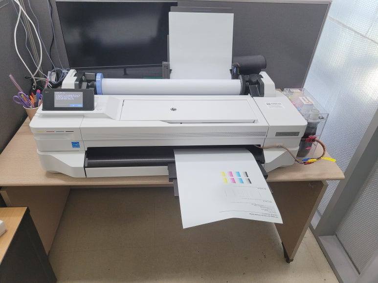 건축건설 플랜트 관련 사무실에서 도면 출력용으로 사용하는 HP DesignJet T130 24인치 플로터 A1 출력 대형 프린터 무한잉크인데 프린터 오류 프린터 또는 잉크시스템에 문제가 있습니다. 문제로 출장수리 요청하여 스케줄 잡아 방문 출장 수리를 완료했습니다.
