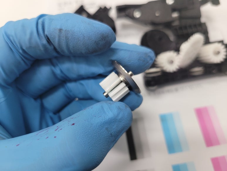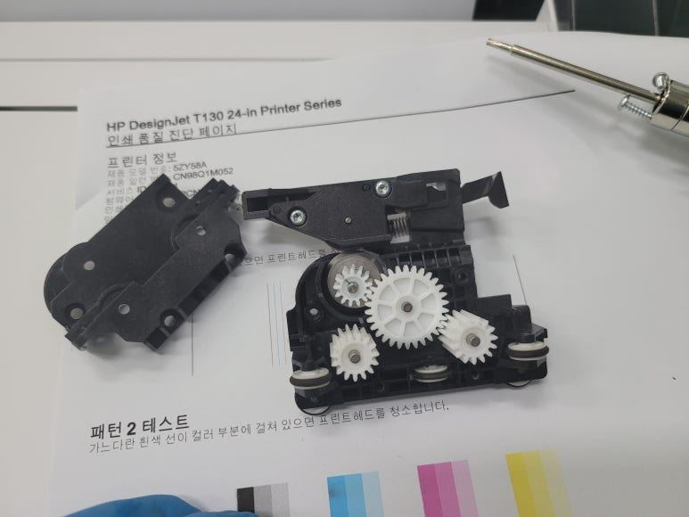 HP DesignJet T130 플로터 프린터 오류, 잉크 시스템 문제HP 711 프린트 헤드 분해 수리 및 노즐 세정, 칼날 기어 크랙 교체