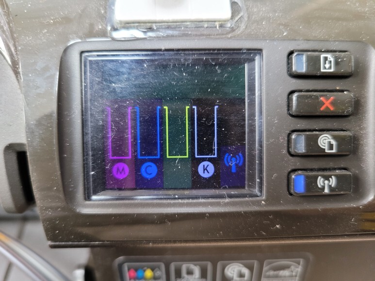 전원 버튼을 누른 상태에서 취소 7회 눌러 헤드 노즐 점검 페이지를 출력해 확인했습니다.