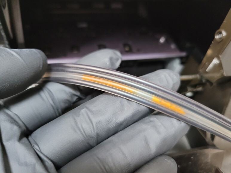 호스 내부에 잉크가 빠지고 경화되어 막혀 잉크가 전혀 공급이 안되고 있어 공급선을 세정액으로 세척했습니다.