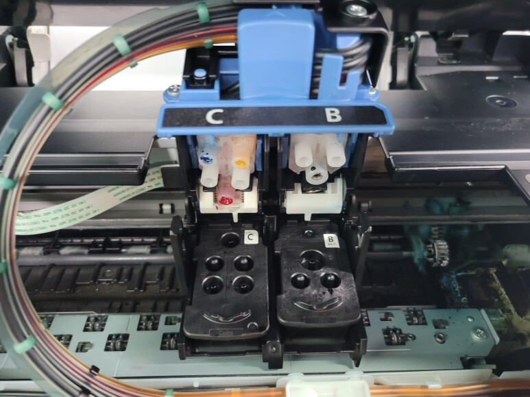 프린터 내부의 잉크공급선에 마젠타 (빨강) 및 블랙 색상의 호스 내부에 잉크가 심하게 빠져 있었습니다.