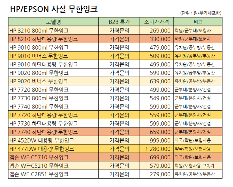 단, 출력량**이 많다면!!!!! 50~90 만원대 오피스용 HP 및 엡손 사설***무한 사용을 권장합니다. (출력량이 많은 보험사 교육사 분양사 군부대 학원 부동산 모바일샵 등등..)
