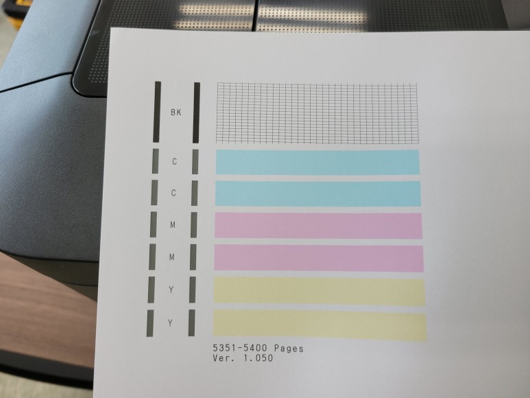 새 캐논 맥시파이 헤드 교체 후 인쇄 노즐 점검 페이지를 확인했습니다. 정상 출력 되었습니다.