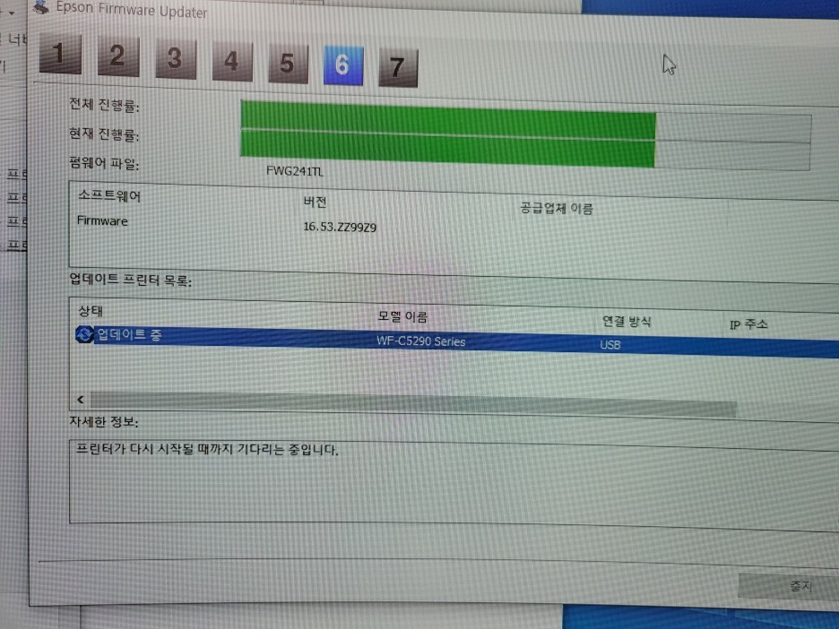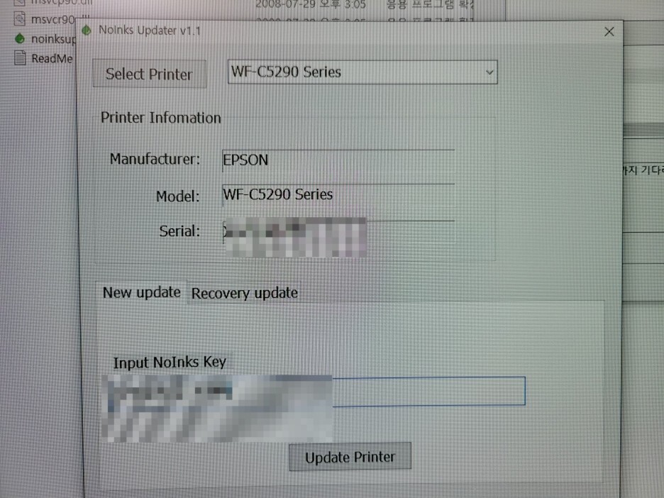 엡손 C5210 C5290 펌웨어를 실행하면 프린터가 업데이트 후 자동*재부팅됩니다. 프린터가 재부팅되면 완료이므로 펌웨어 프로그램은 100% 완료가 되지 않아도 강제종료합니다. 무한인증키 프로그램을 실행하여 인증키를 입력합니다. 인증키를 입력하면 추후 업데이트시 복구가 가능한 백업 복구 파일이 생성됩니다. 추후 복구를 위해 잘 보관해야 합니다. 프린터 전원을 끄고 재부팅, 칩없이 구동되는 무한잉크 장치로 전환됩니다.