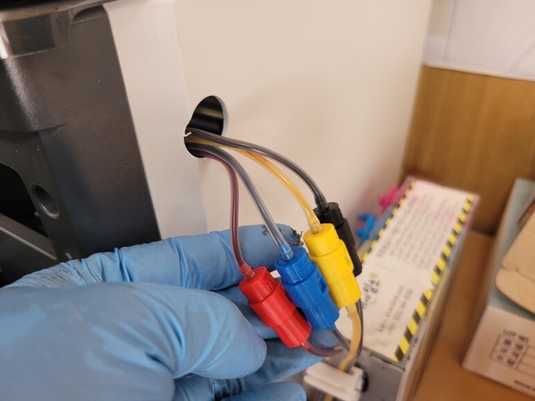 HP 7740 하우징 타공하여 호스를 밖으로 배출했습니다. 잉크 퀵차단밸브를 장착하여 잉크공급기와 결합 연결했습니다. 잉크 석션하여 호스 및 카트리지 내부에 가득 채우고 No Chip 인증칩을 부착(추후 폐기) 카트리지를 헤드에 재장착했습니다