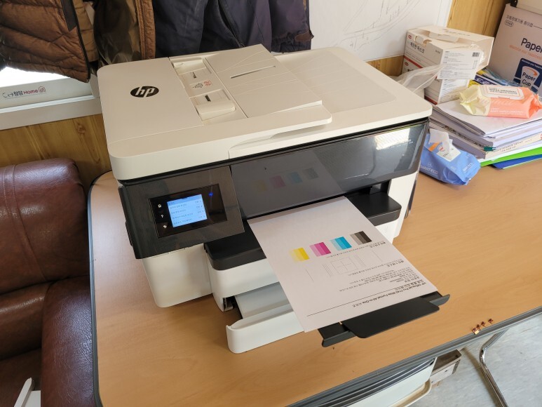 경기도 광명시 아파트 재개발 신축 건설현장 사무실에서 사용하는 A3 팩스복합기, HP 7740 무한잉크로 업그레이드 및 잦은 카트리지 문제 및 소모품 시스템 문제로 멈춰버린 유한 4칩 HP 7740 무한잉크 장비를 기업형, B2B용 (보험사, 군부대, 학교, 학원, 부동산, 핸드폰매장, 교육사 등등)으로 사용되는 칩없이 구동하는 기업형 No Chip 무한잉크 장비로 전환 출장수리 요청으로 스케줄 맞춰 방문하여 수리 완료 했습니다.