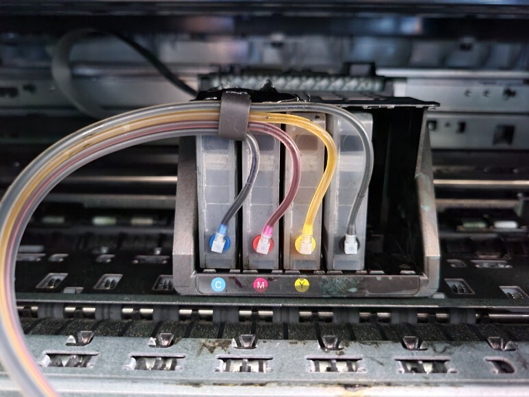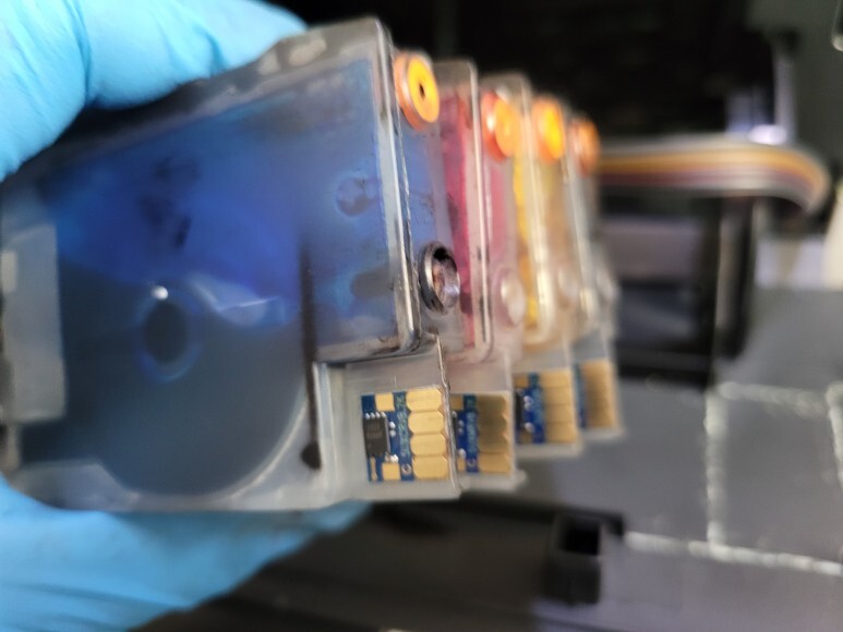 카트리지 잉크 셕션하여 호스 및 카트리지 내부에 잉크를 가득 채우고 클램프 부착 및 핫멜트 보강하여 카트리지 장착 후에 호스를 단단히 고정, 정리하였습니다.