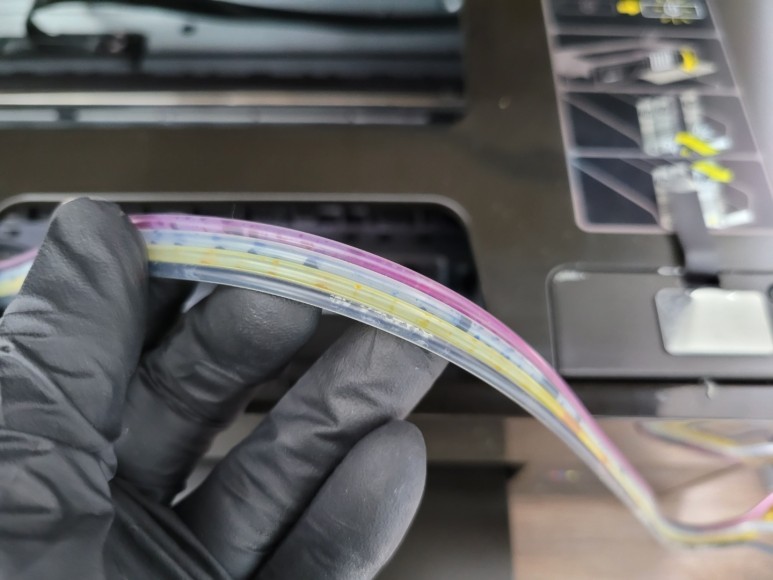 잉크 카트리지 소모됨 문제 및 공급선, 호스 내부에 잉크가 모두 빠지고 내부에 잉크가 굳어 전혀 잉크가 공급되지 않았습니다. 블랙 호스 내부에 심하게 잉크가 경화되어 세정액으로 세정했습니다.