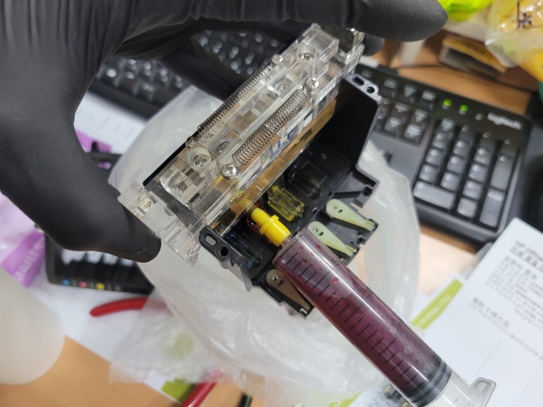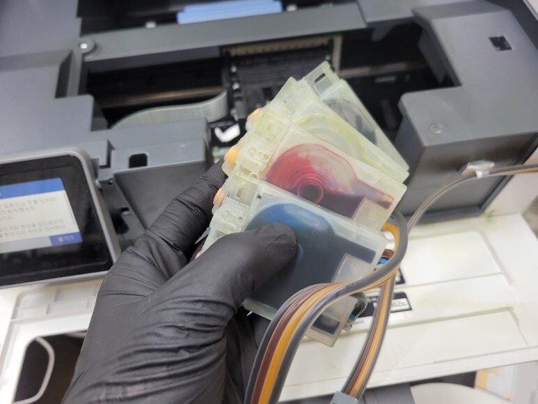 카트리지에는 잉크가 차 있었습니다. 헤드 노즐 및 잉크 트러블을 의심하고 수리 진행했습니다.