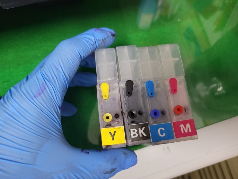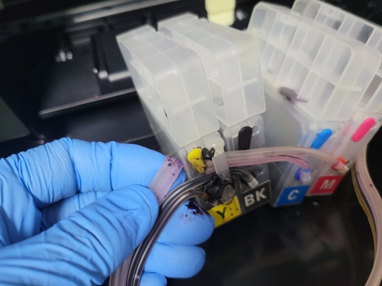 시안과 마젠타 잉크가 전혀 공급되지 않아 보니 호스가 절단되어 있었습니다.
