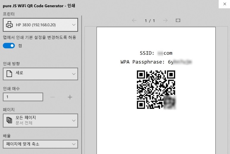 삼성이 아닌 LG 또는 아이폰의 경우는 pure JS WiFi QR Code Generator 사이트로 이동하여 Wi-Fi 아이디 및 비번을 적으면 QR코드가 생성되어 캡쳐 또는 프린팅 할 수 있습니다.