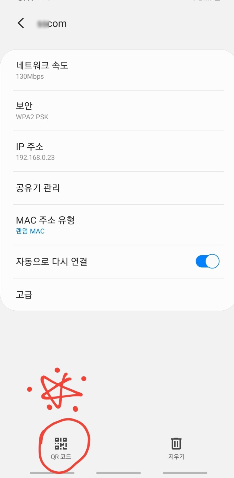 삼성 스마트폰은 쉽게 설정 ➝ 연결 ➝ WiFi ➝ 현재 네트워크로 이동합니다.