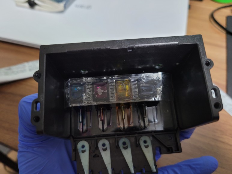 일단 노후되고 오래된 잉크 퀵차단밸브를 신형으로 교체했습니다. 잉크를 석션하고 최대한 안정적으로 클램프로 단단히 호스를 고정하고 핫멜트로 보강했습니다. 헤드 오류 및 출력 불량이 일어나길래 헤드를 분해해봤습니다.