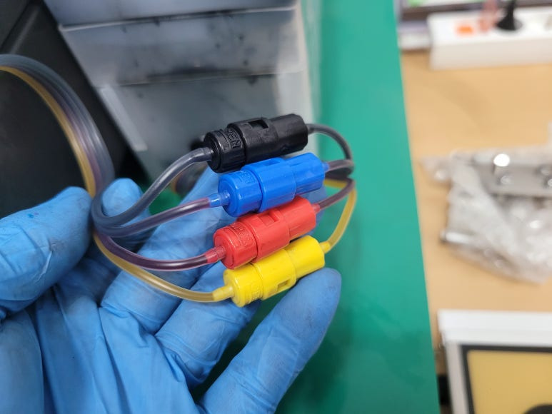● 잉크공급라인 호스 내부 잉크 경화로 세정액 주입 세척