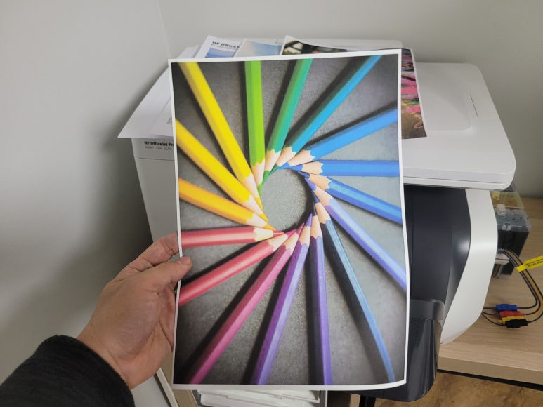 경기도 고양시 덕양구 오금동 소재, 가정에서 재택근무용으로 스캔, 팩스 및 문서 출력용으로 사용하는 HP OfficeJet Pro 8730 팩스복합기 인데 잉크가 고갈된 정품 카트리지를 제거하고 색당 200ml 무한잉크 장치로 장착요청하여 스케줄 잡아 이동, 방문하여 수리 완료 했습니다.