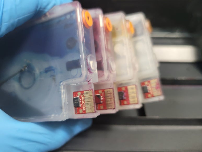출력불량 및 잉크 카트리지 문제로 빠른 전체 점검 필요 이유 : 1. 호스 내 잉크 경화로 잉크공급 不 2. 카트리지 부싱 및 패킹 노후로 공기유입으로 잉크공급 不 3. 헤드 內 잉크공간 챔버 터짐 (칩판부 슈팅에어라인 비닐탈락, PCB 오염) 4. 스테이션 펌핑모터 불량으로 인한 잉크공급 不